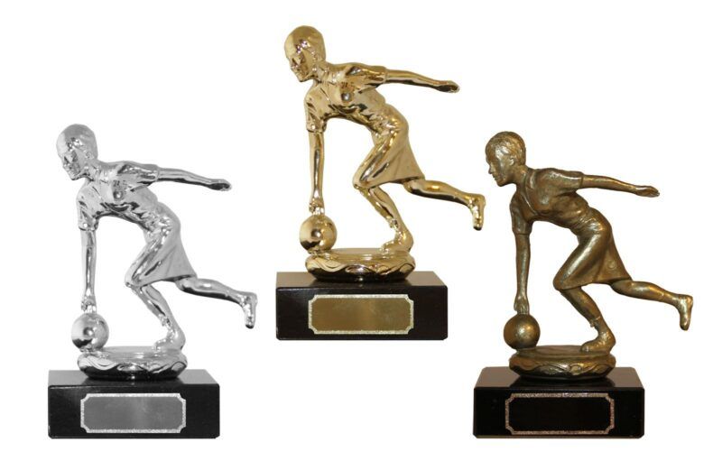 Bowlingspiller montert på sort marmorsokkel.