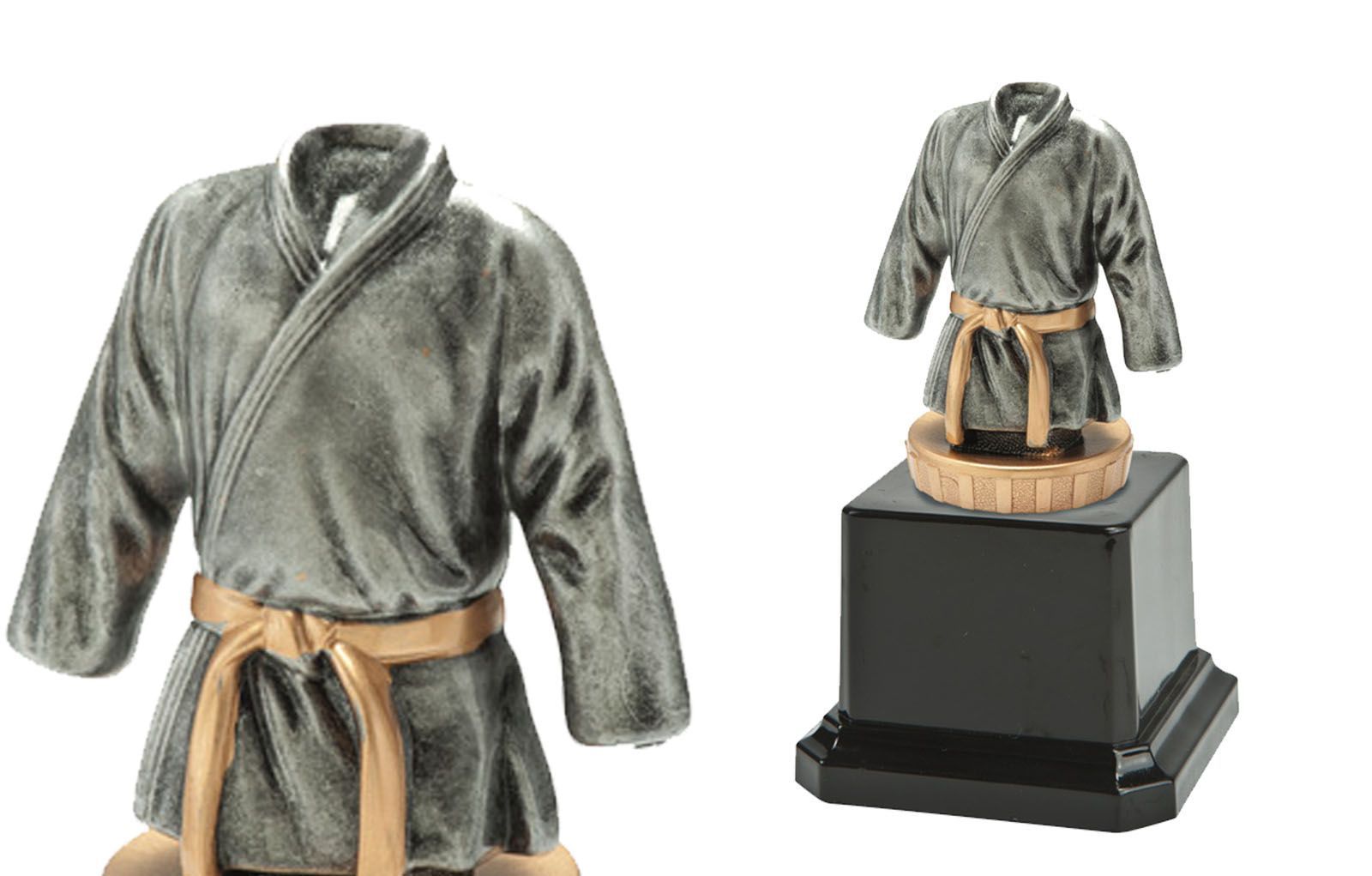 Karate-figur på høy sort sokkel.