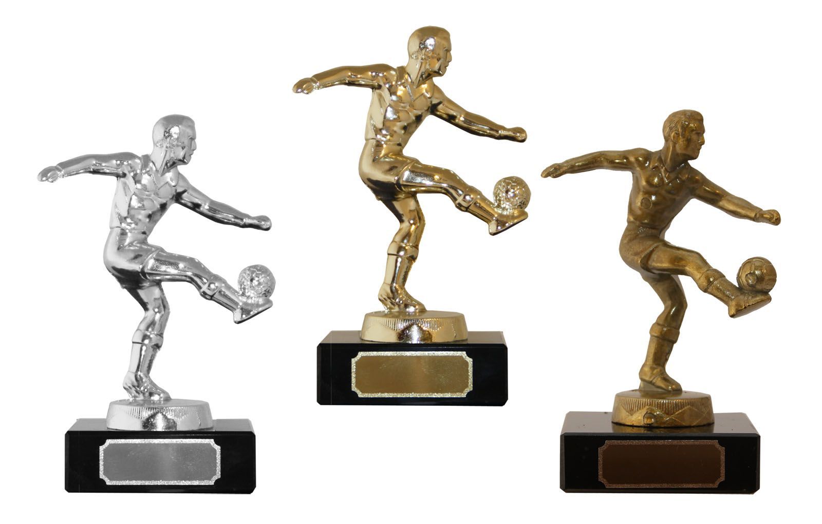 Fotball herrefigur i metall.Graveringsplate på sort marmorsokkel.