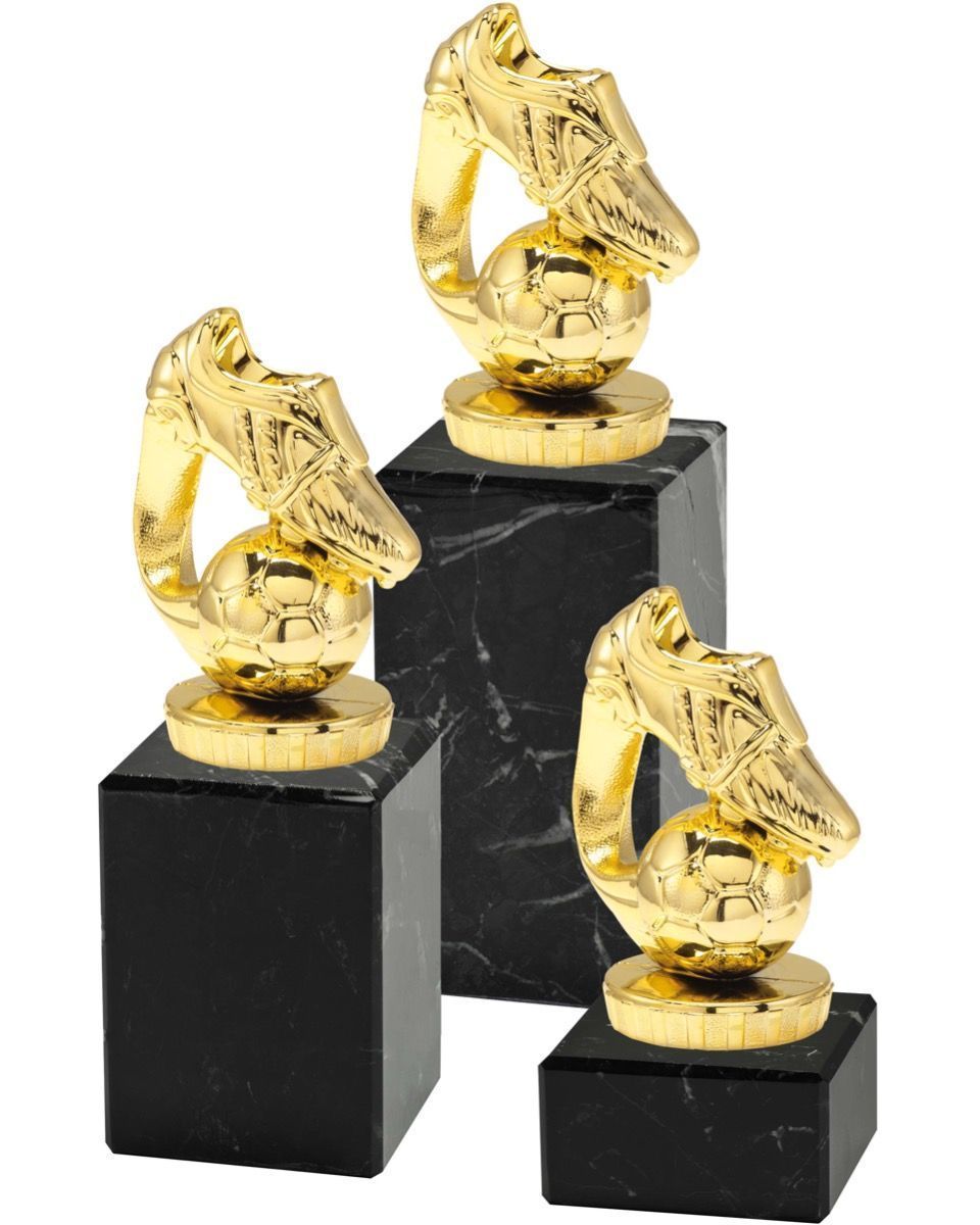 Fotballstatuett på høye, flotte marmorsokkeler.