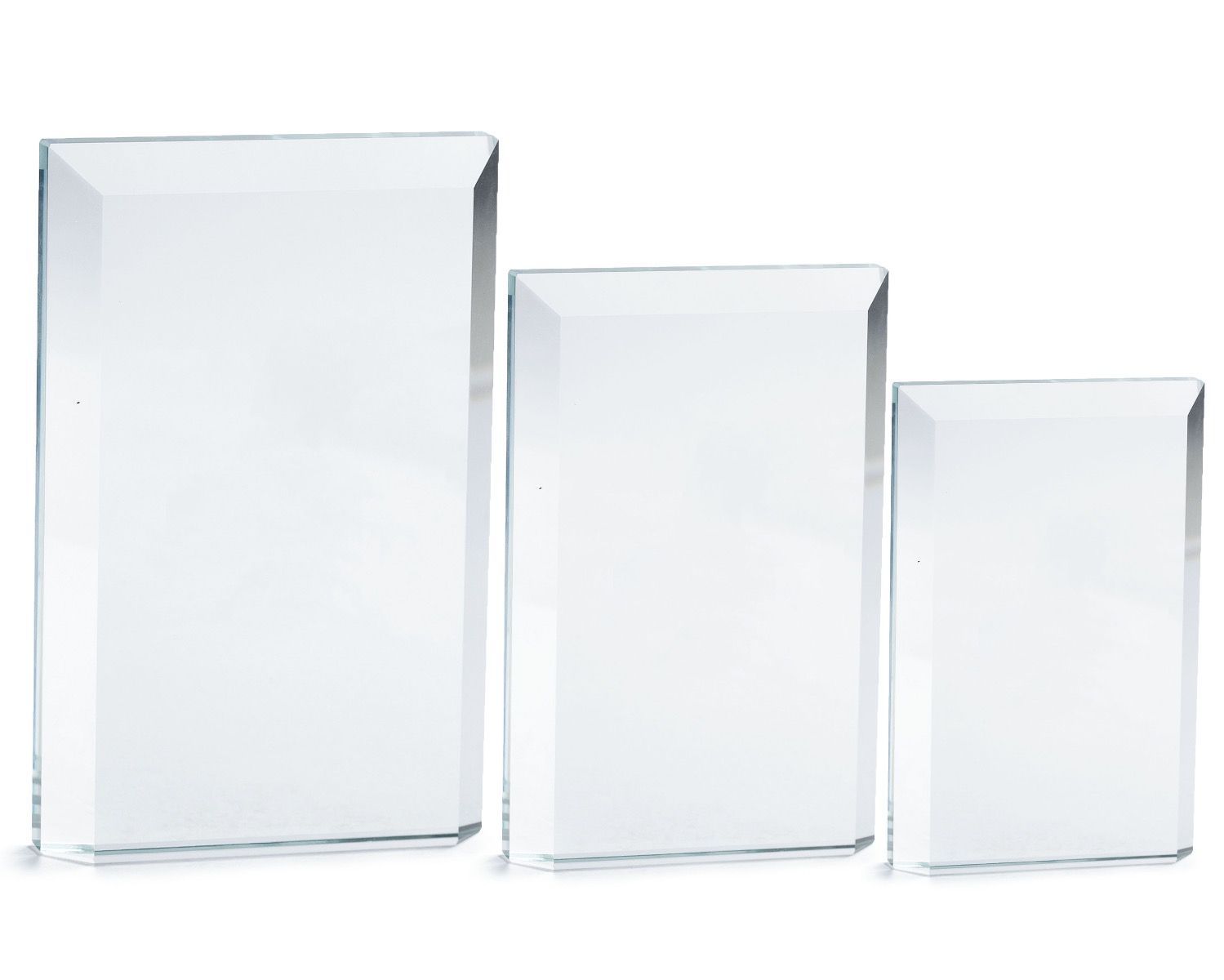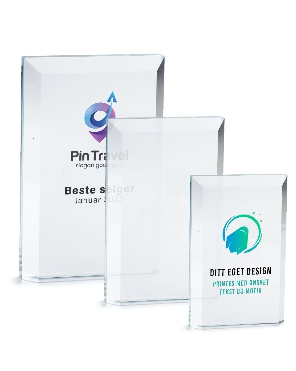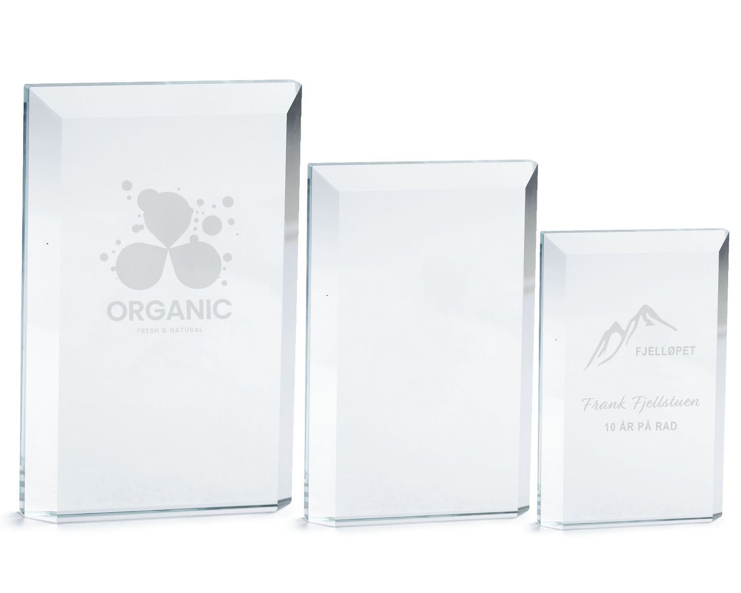 Glassplakett med flotte diamantslipte kanter. Glassplaketten kan stå av seg selv og leveres i en fin eske.