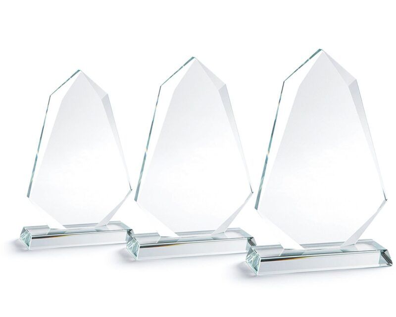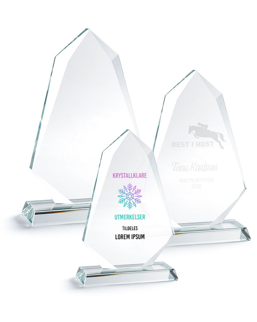 Glassplakettene Isberg, er en solid og tung plakettserie. Plakettene leveres i etui. Få lasergravert egen logo, motiv og/eller tekst. Glassplaketten er en lekker premie i høy kvalitetet til heldige vinnere eller til månedens medarbeider/selger.