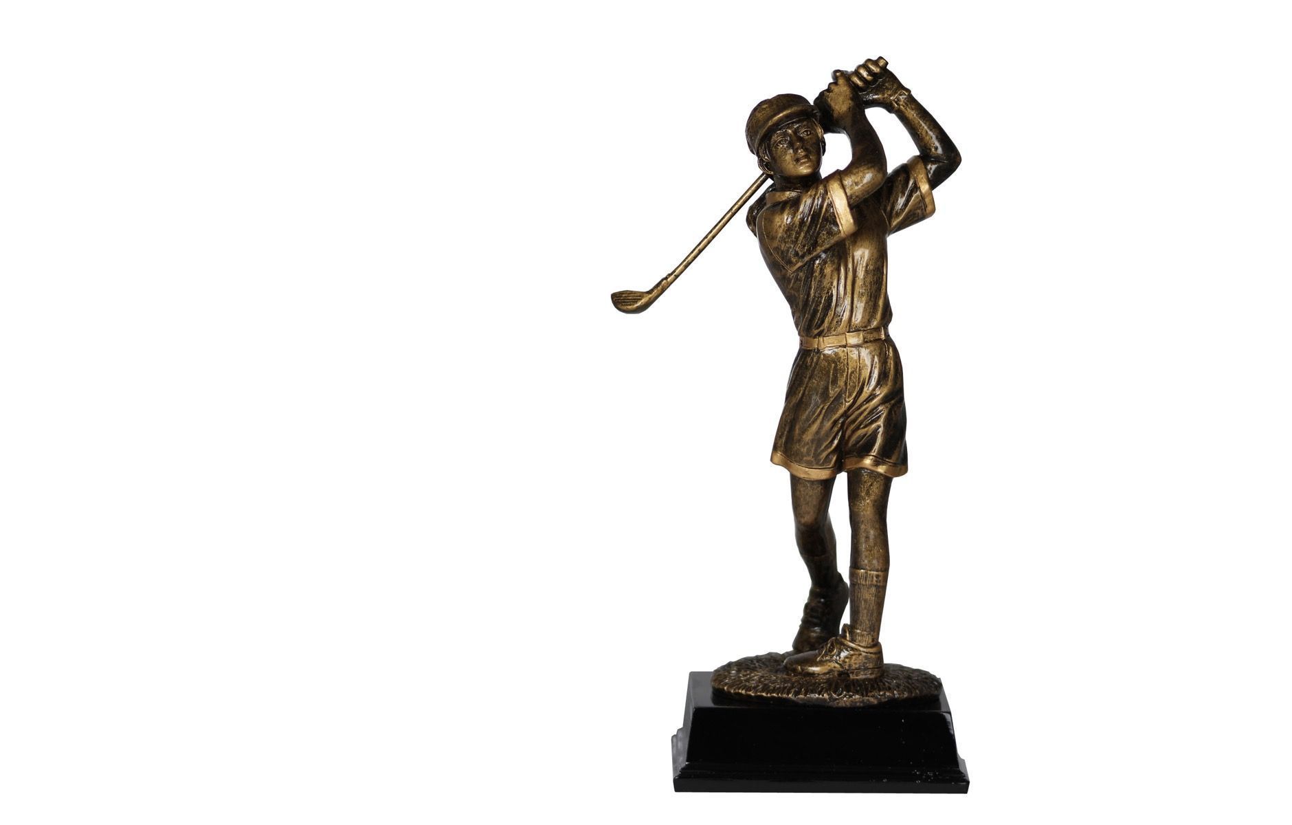 Dame-golfspiller helstøpt i resina. Antikk bronse-farget statuett. Flott premie på golfturneringer og for golf-entusiaster.
