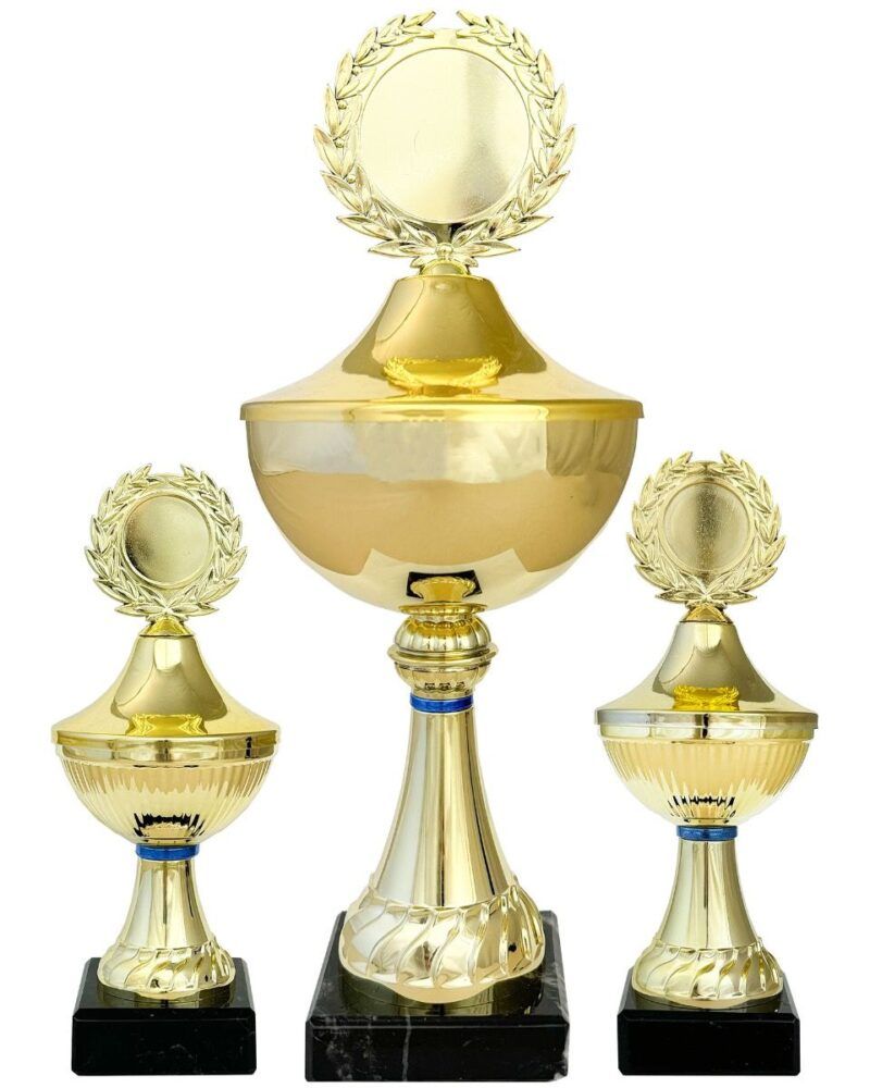 Liten pokalserie i gullvalør med blå detaljer.
