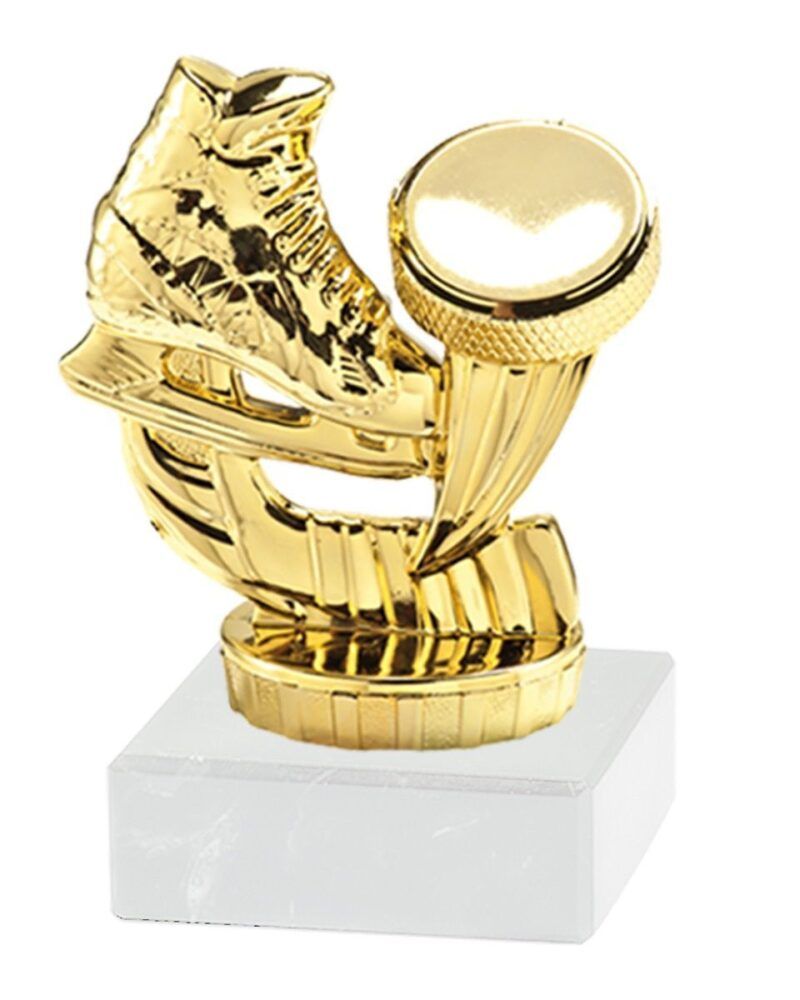 Hockeystatuett i hardplast på hvit marmorsokkel.