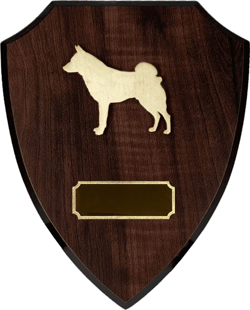 Stilig treskjold i mørkt tre – valgfri huderase skåret ut i lyst treverk.
