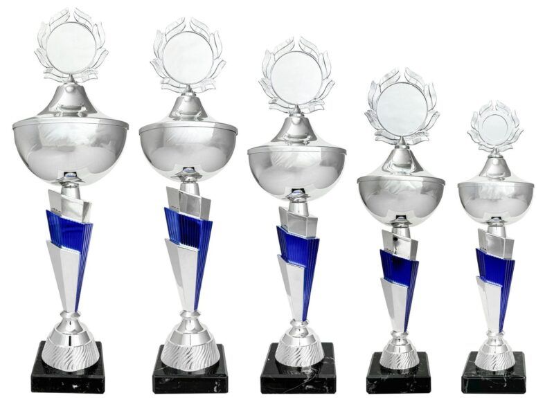 Sølvpokalserie med blå detaljer.