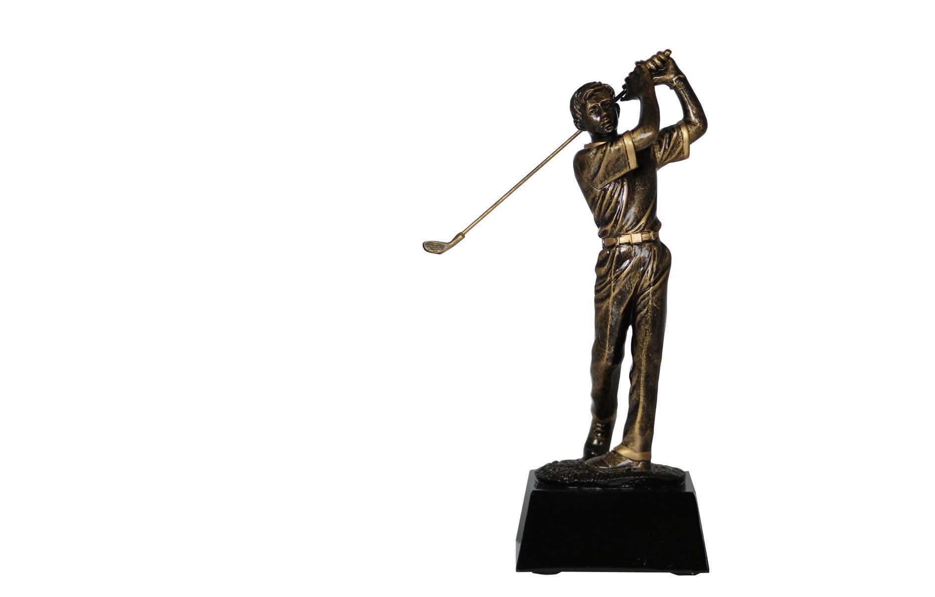 Herre-golfspiller helstøpt i resina. Antikk bronse-farget statuett. Flott premie på golfturneringer og for golf-entusiaster.
