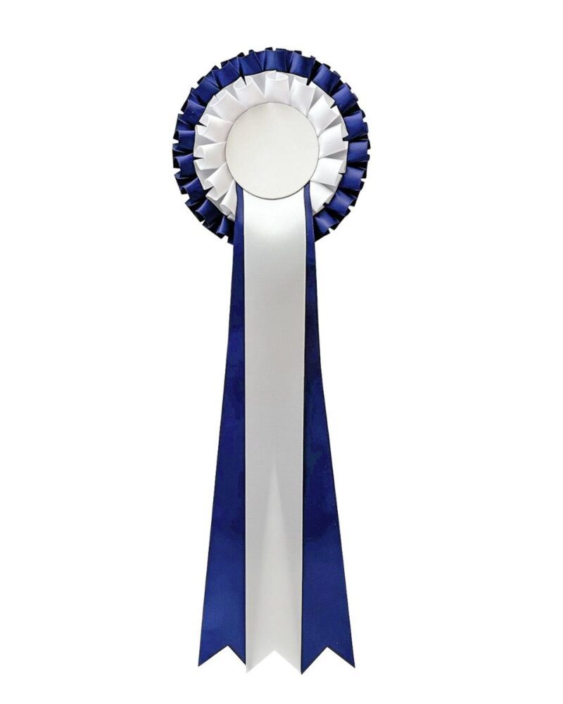 Rosetter i mørkeblå og hvit farge, Rosetter som passer perfekt til hest- og hundeshow.