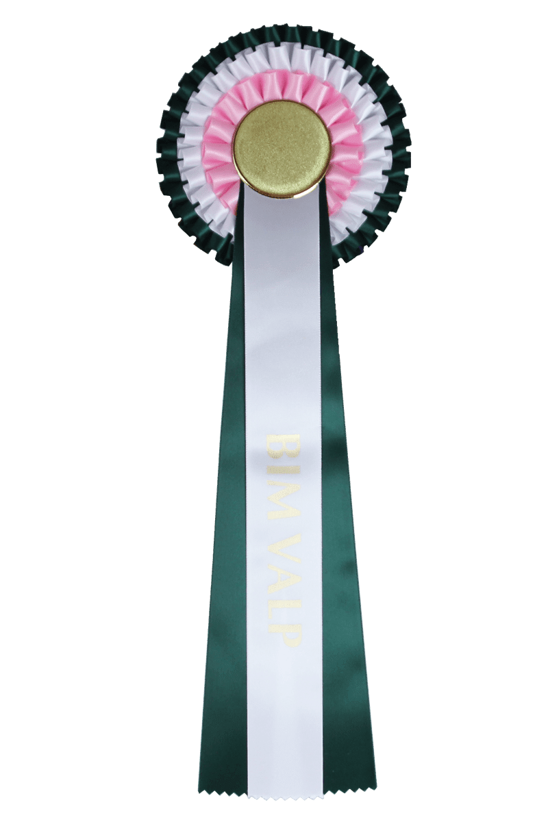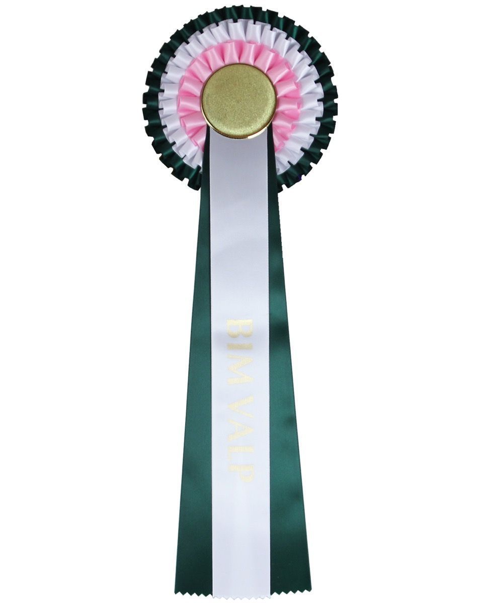 Rosetter i grønn, hvit og rosa. Rosettene er ferdig trykt med BIM VALP. Rosetter som passer perfekt til hundeutstillinger.
