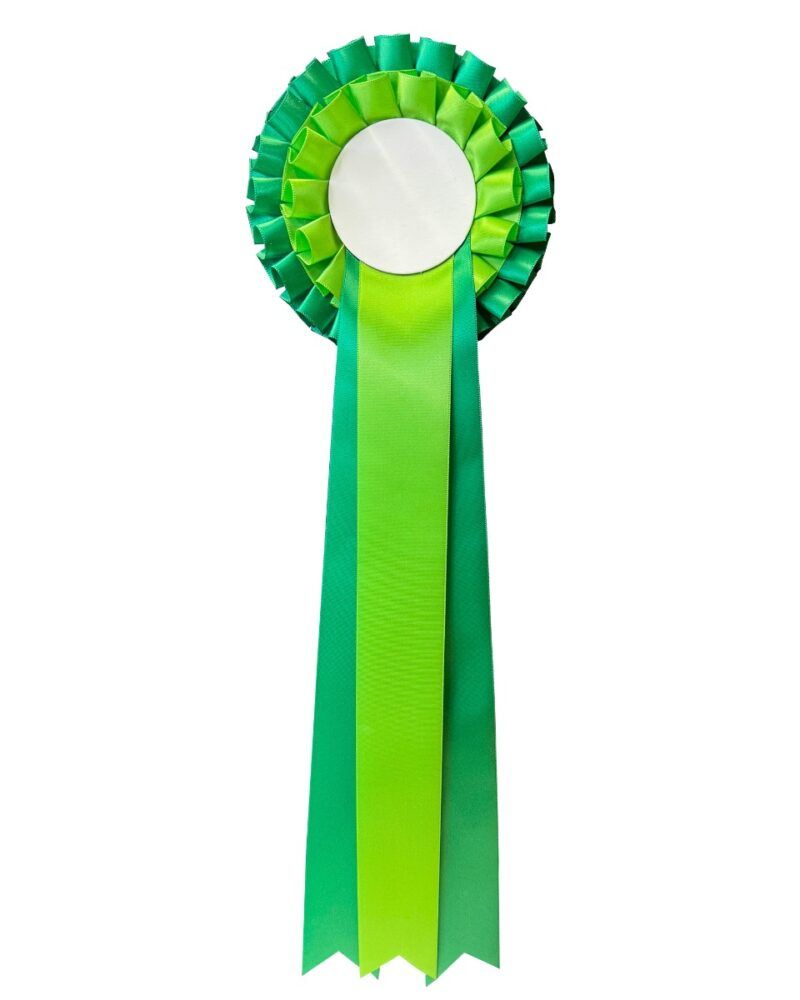 Flott rosett med 3-lags bånd og 2 kranser. Kan graveres med egen logo og eller tekst i senterfeltet.