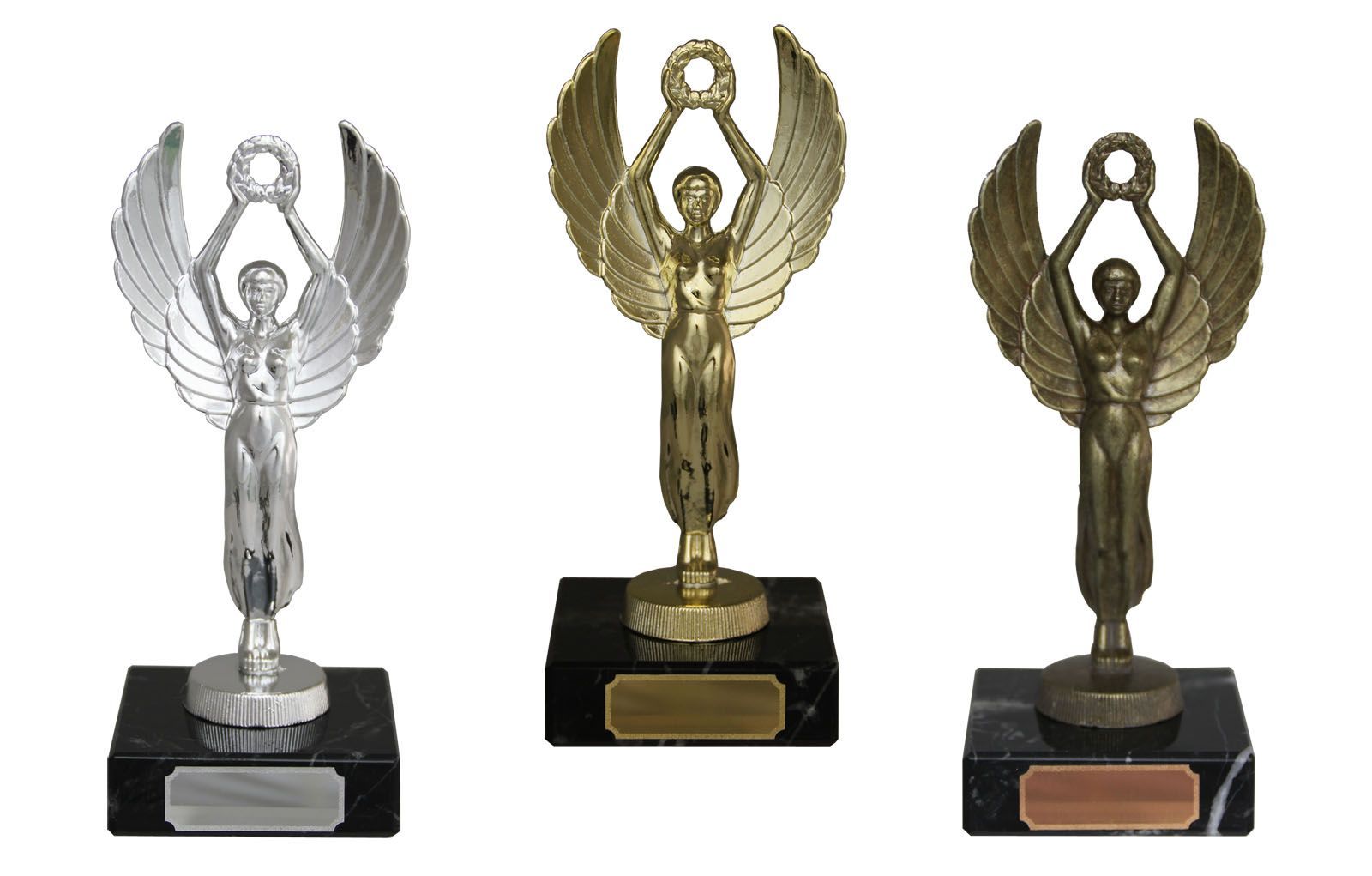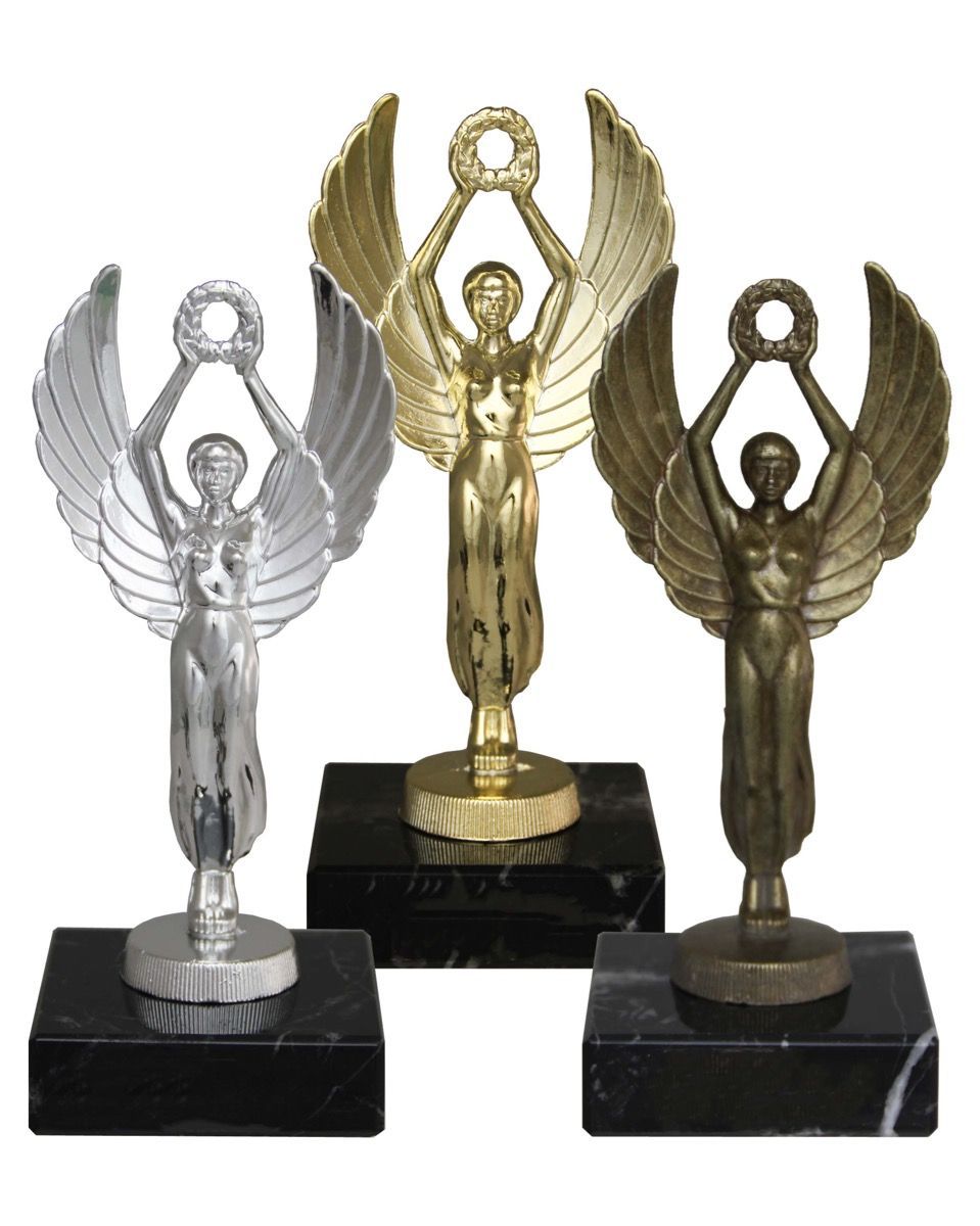 Seiersgudinne i metallfigur Gravering på plate på sort marmorsokkel.