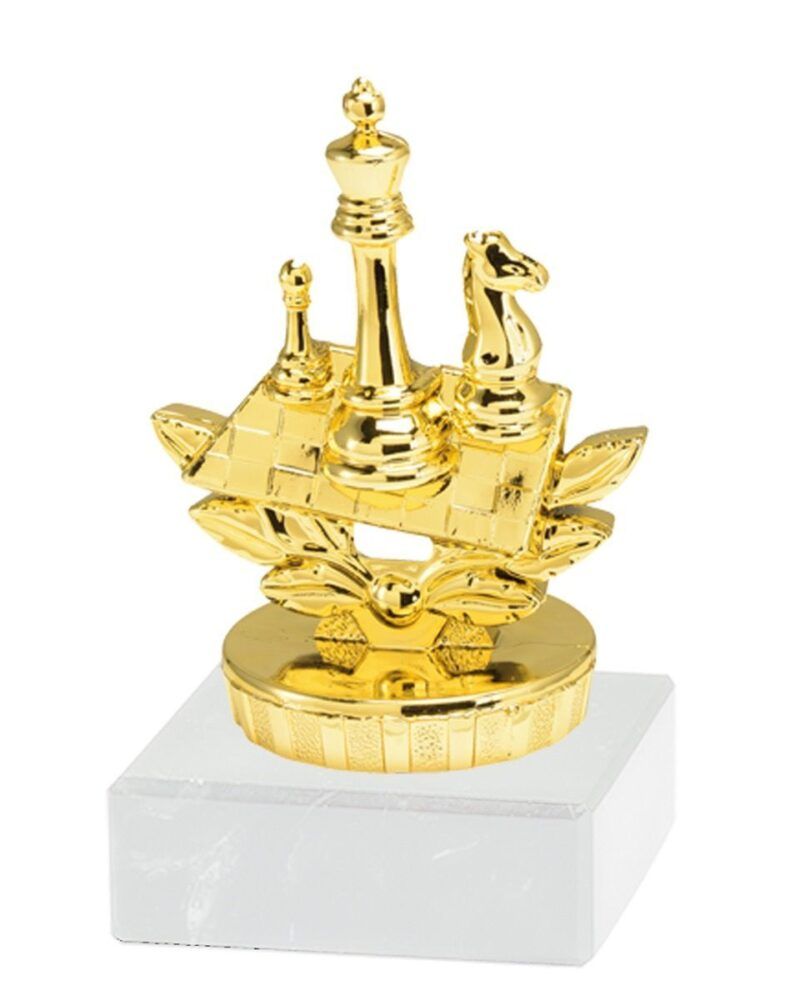 Sjakkstatuett i hardplast på hvit marmorsokkel.