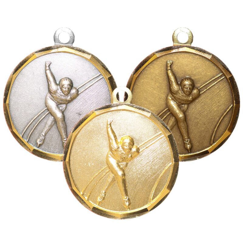 Skøytemedalje i gull-, sølv- og bronsevalør.