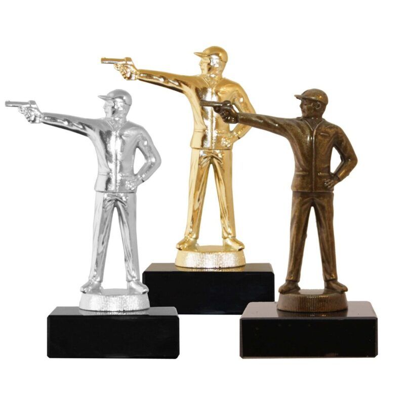 Pistolskytter metallfigur på sort marmorsokkel. Gravering på plate som festes på sokkelen.