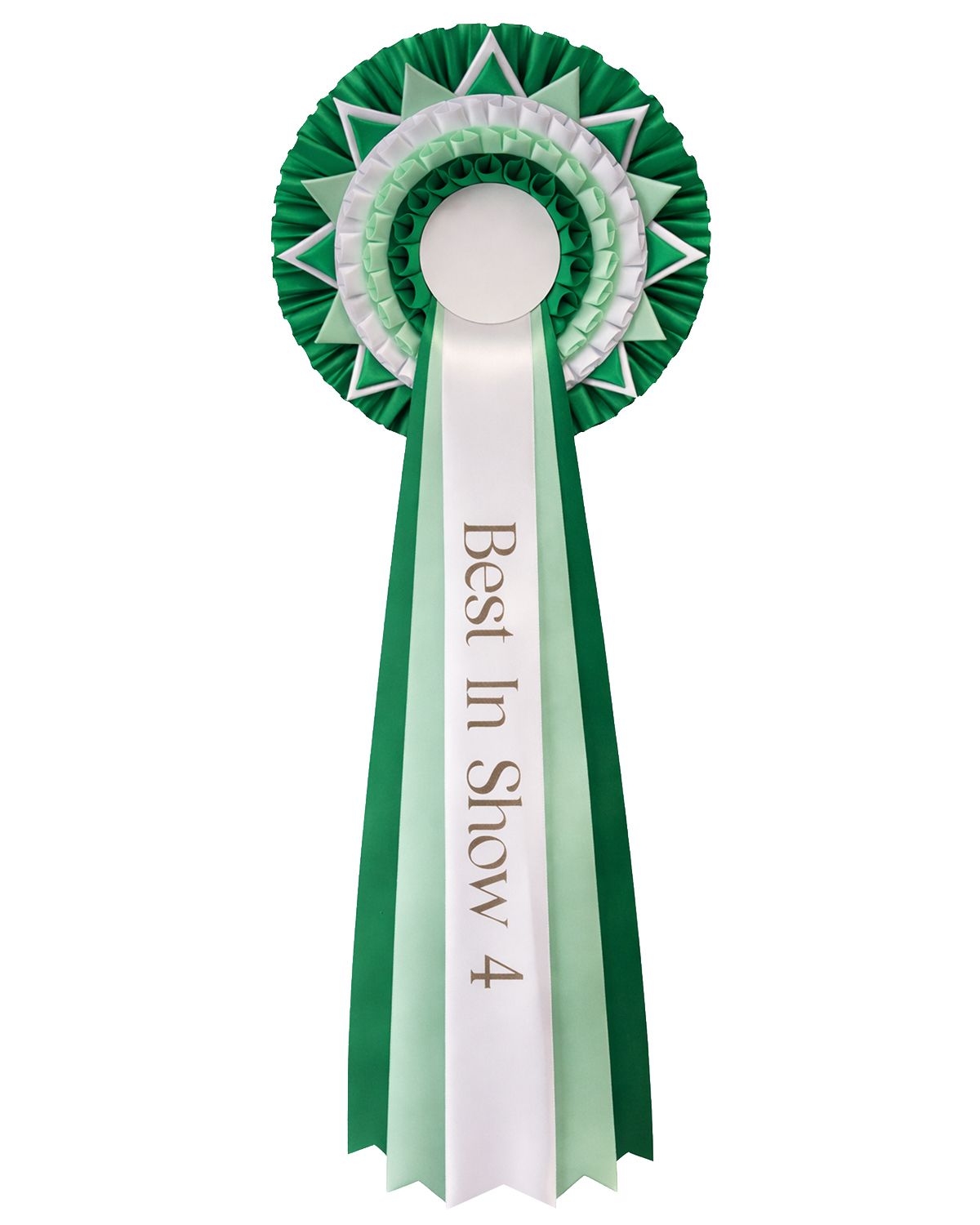 Rosetter i silkemykt, resirkulert stoff i elegante grønne nyanser. Et bærekraftig og stilrent valg til utstillinger og konkurranser.