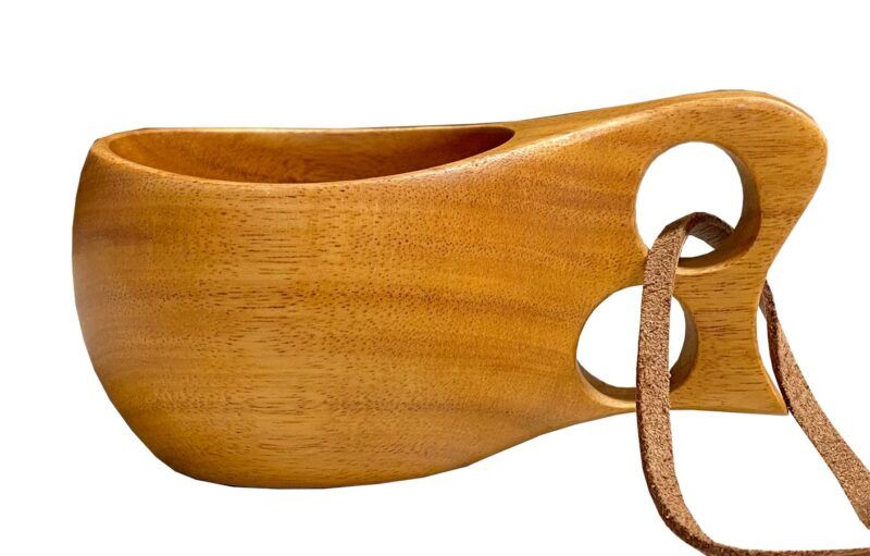 Turkopp i tre, med lærreim. Lett og praktisk på tur.