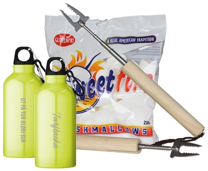 Turpakke: grillspyd, drikkeflasker og Marshmallows