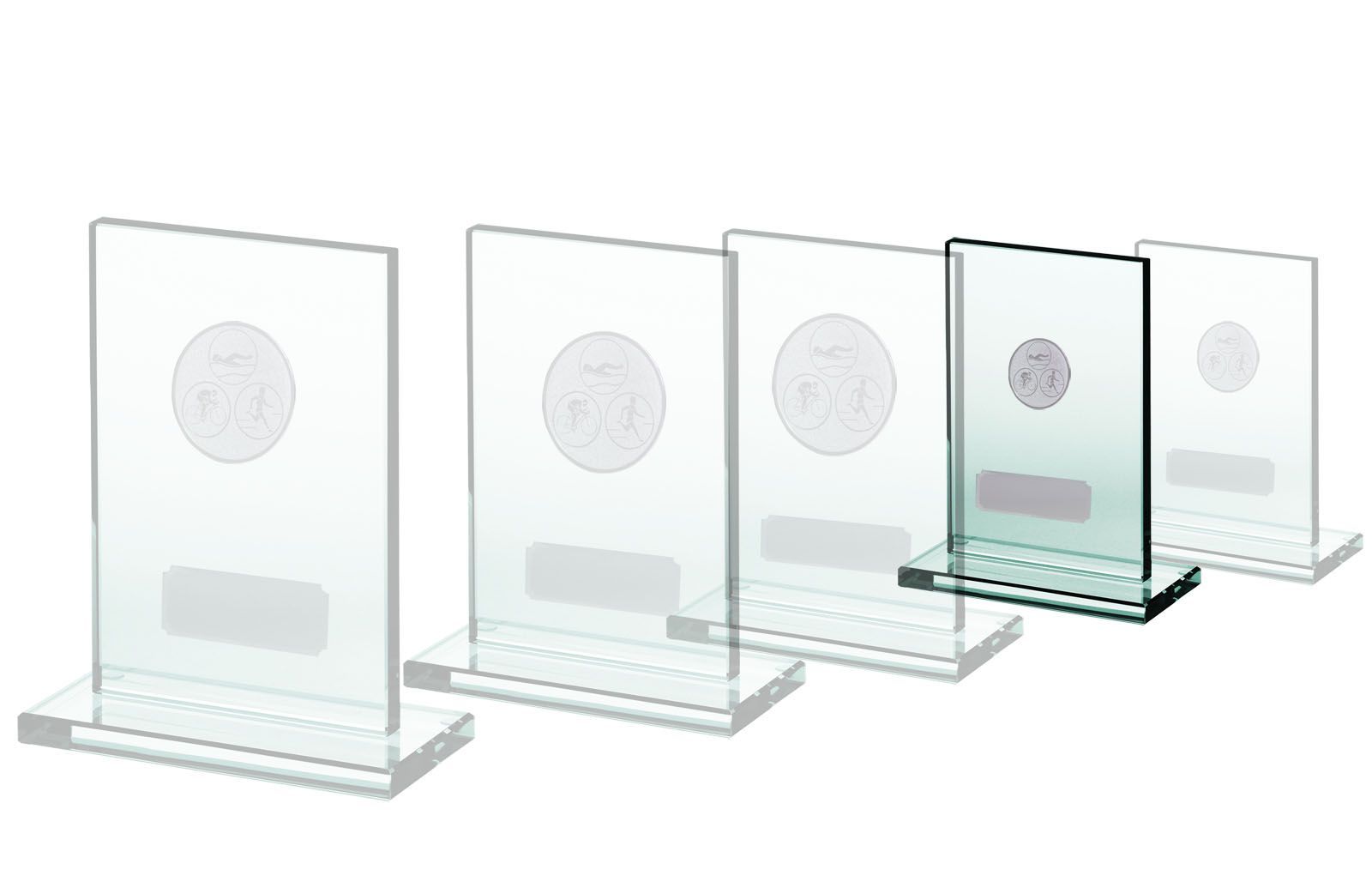 Glass plakett med valg fri idrett eller aktivitet. Høyde 11 cm, 13 cm og 16 cm.